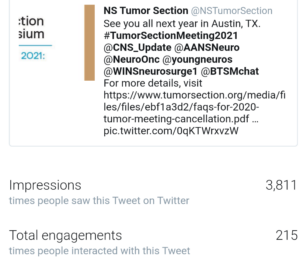 Finally, the Tumor Section Instagram page, @NSTumorSection, now has 2,174 followers, almost double a year ago. We have seen rapid expansion of this group. For neurosurgery, Instagram is becoming a great platform to share videos and media from your practice to engage with the general public. If you share pictures/videos and tag us in them, we can then repost them and boost your profile to our followers.